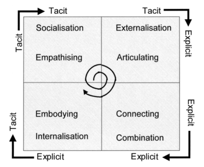 The SECI model that was introduced by Nonaka and Takeuchi (1995) stands for four stages involved in knowledge creation: Socialization, Externalization, Combination, and Internalization. Tacit knowledge is shared through Socialization, which is then articulated into explicit knowledge during Externalization. The explicit knowledge can then be further synthesized and organized in Combination and finally absorbed into individuals’ tacit knowledge through Internalization. This cyclical process creates a “knowledge spiral,” enabling the ongoing creation and sharing of knowledge within and beyond an organization. The diagram that illustrates the four processes can be seen in Figure 1 below.